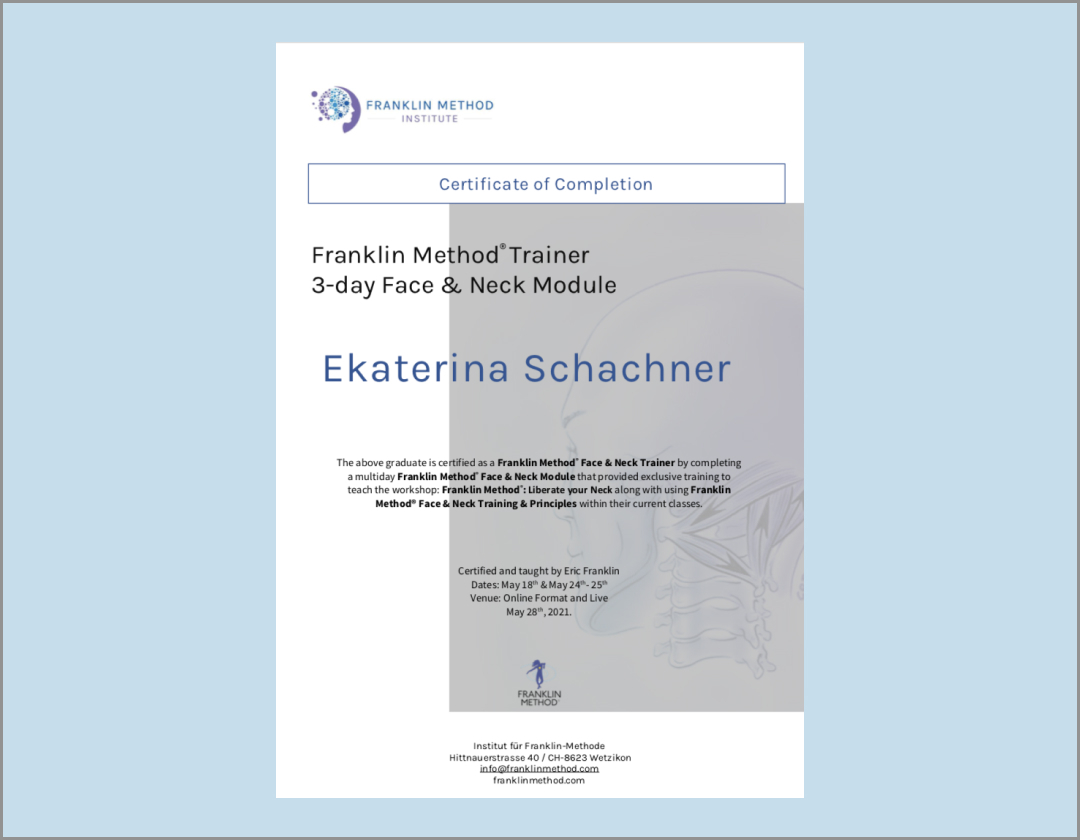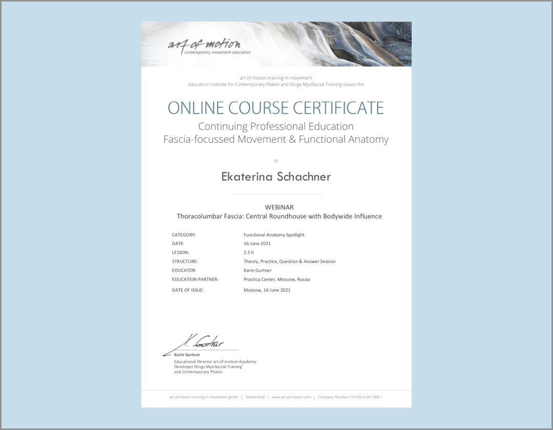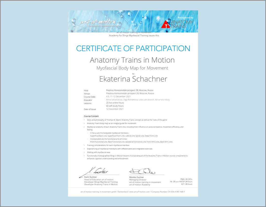 Моя авторская методика — это синтез приёмов, интеграция в каждое занятие методик и техник, тщательно отобранных с обучения в международных, российских школ движения и личной практики. Я миксую, чтобы каждое занятие становилось максимально эффективным и разносторонним. Такой подход позволяет даже в условиях современной жизни, наполненной стрессом и спешкой, решать широкий спектр задач оздоровления и гармонизации.